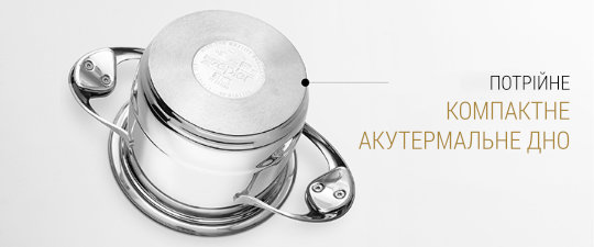Запатентоване потрійне дно Zepter Accuthermal Compact Bottom (ZAC) - серце правильного та довговічного способу приготування здорової їжі від Zepter. Виготовлене з 3 шарів легкого металу: індуктивного, акумулятивного та провідного. Стискається пресовим верстатом під тиском до 2000 тонн (не склеєне та не паяне). Незнищенне, компактне та не деформується після використання.