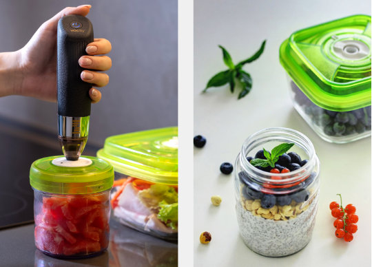 VacSy® - це всесвітньо запатентована система вакуумного зберігання їжі, призначена для створення вакууму всередині спеціальних скляних контейнерів і спеціальних герметичних пакетів. Вакуумне середовище позбавляє бактерії, плісняву та гриби кисню, необхідного для їх виживання, і зберігає смак та поживні властивості їжі в незмінному стані! Їжа залишається свіжою та корисною до 5 разів довше, ніж за звичайних умов холодильника.